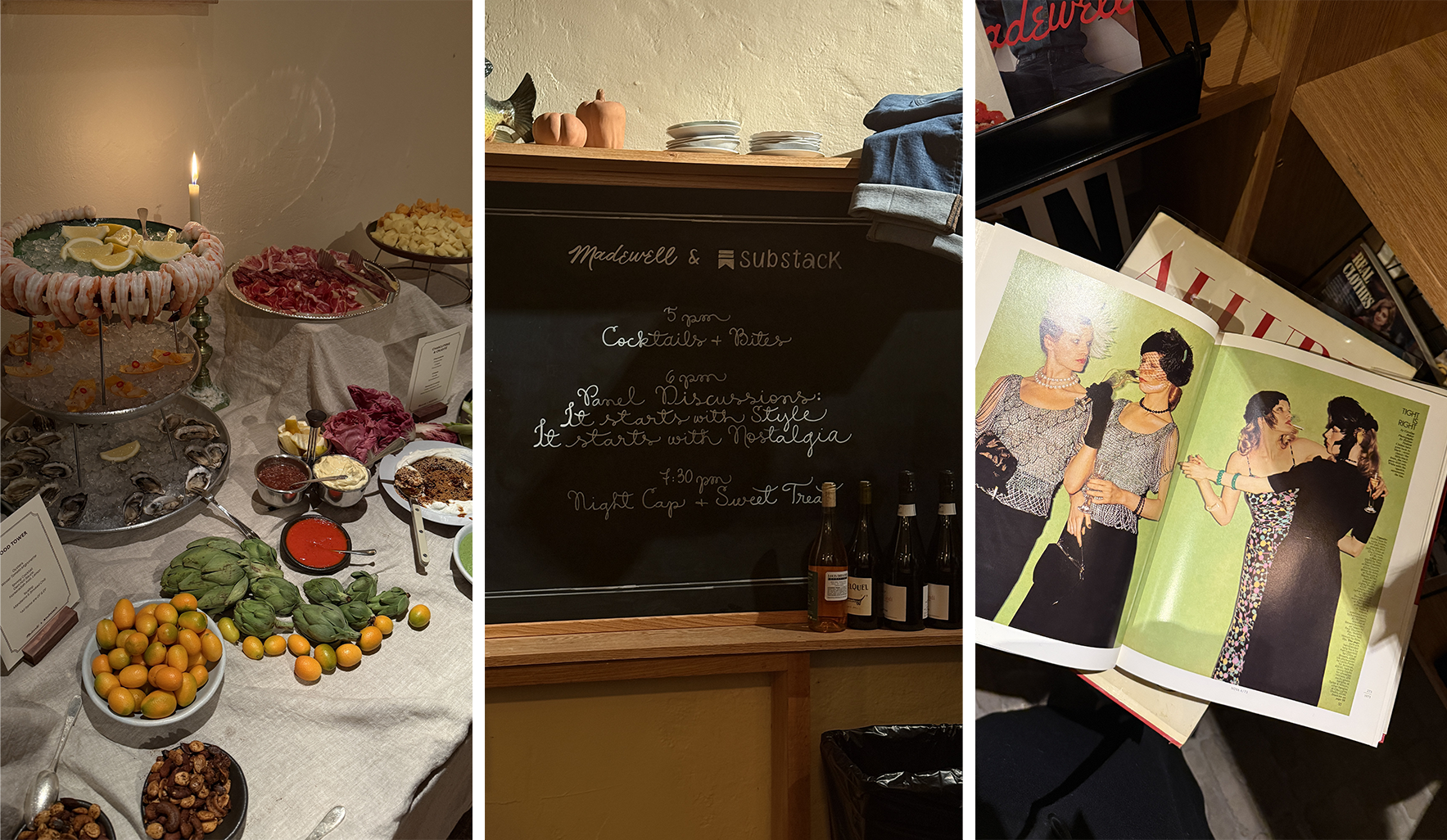 Boy, have they nailed their target audience! In addition to drinks and a gorgeous grazing station, they’ve created a curated Style Library of books and vintage magazines that we can each pick something from. I leave with Helmut Newton’s Pages From The Glossies.