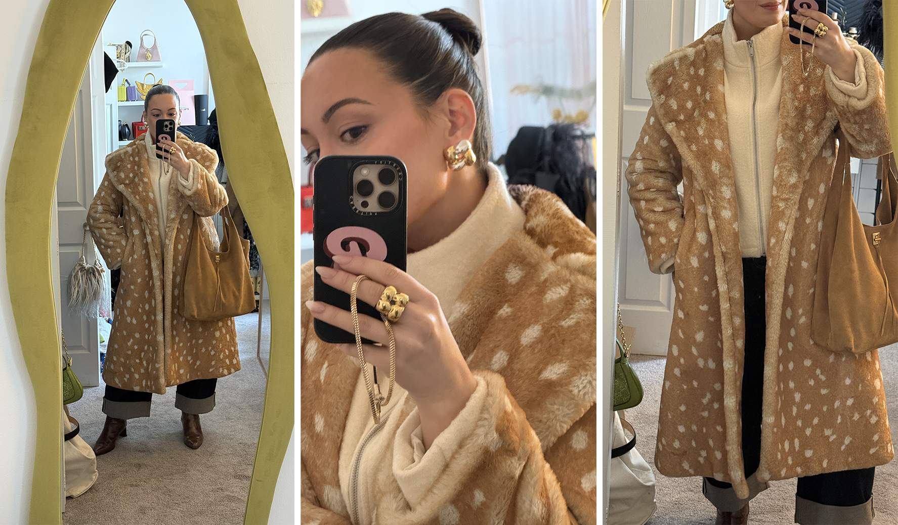 8:40AM A little over the allotted hour later, I’ve gotten completely ready and landed my an outfit for the day. Spanx sent over these stretchy horseshoe jeans, and I couldn’t love them more. I paired them with some new pieces from Jenny Bird’s latest collection (this ring is my fixation) and my Marc Jacobs deer print coat in honor of his great show.