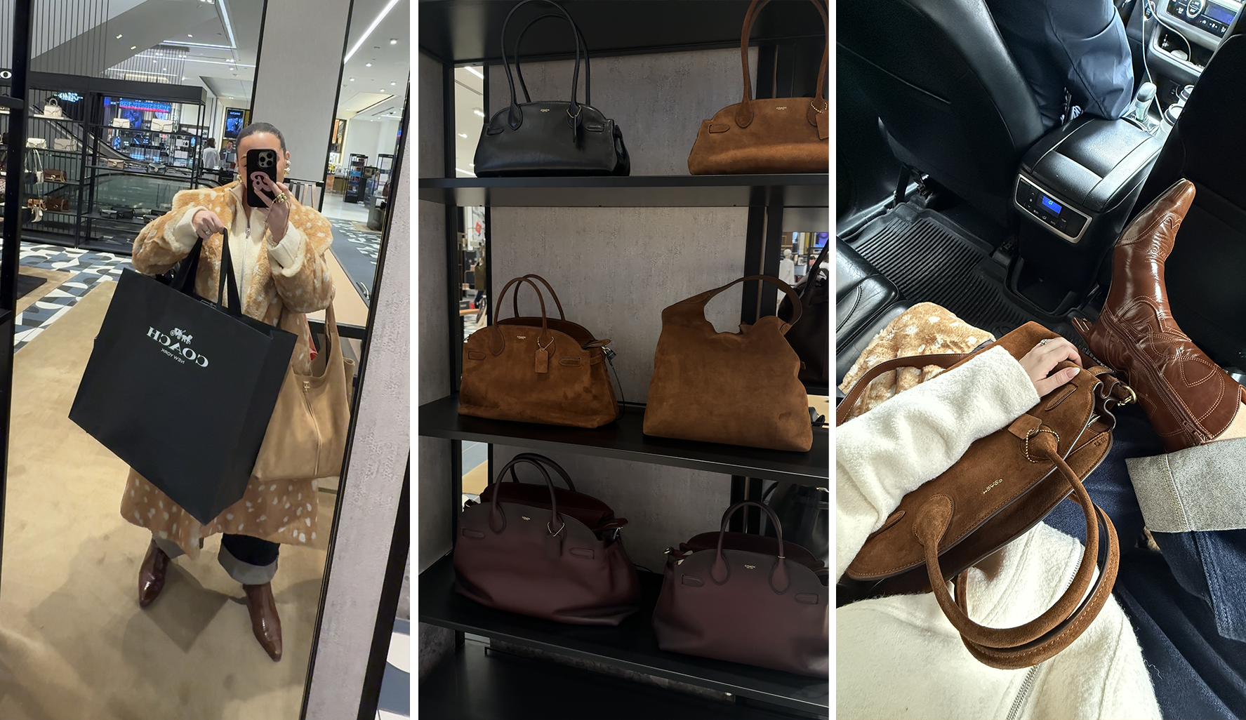11:29AM New items acquired, including a gorgeous suede Coach bag that will serve as the focal point of Thursday’s look. Eager to stop looking like a bag lady, I take off the protective wrapping and start using it immediately, filling it with the contents of two other bags. It’s so spacious!